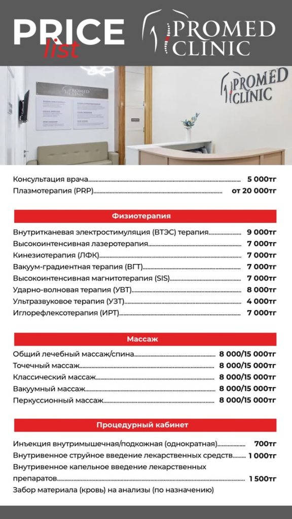 ProMed клиникасы – Астана қ., Р. Қошқарбаев 29 – Қазақстан Республикасының астанасындағы медициналық қызметтердің кең спектрін ұсынатын заманауи медициналық орталық. Филиал жоғары қарқынды лазерлік терапия, инновациялық магниттік терапия, соққы толқыны терапиясы, кинезиотаспа, сонымен қатар тромбоциттерге бай плазманы паравертебральды және буын ішілік енгізу сияқты озық әдістерді қолдана отырып, омыртқа және буын ауруларын диагностикалау мен емдеуге маманданған.